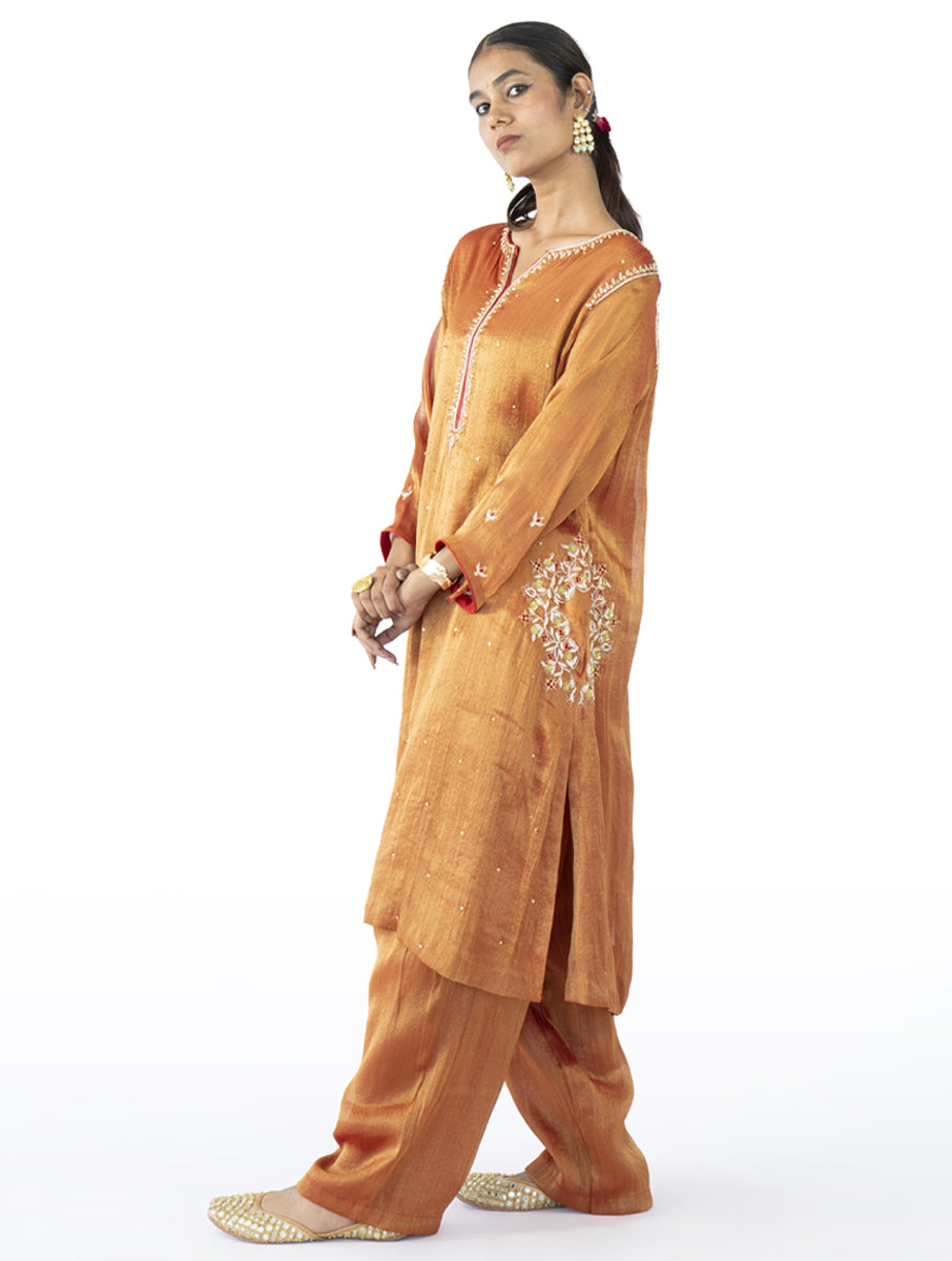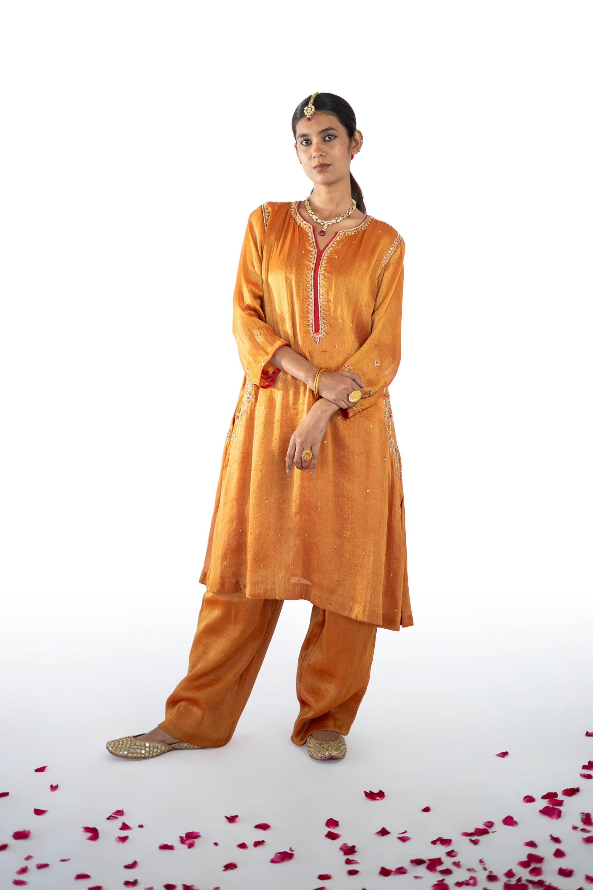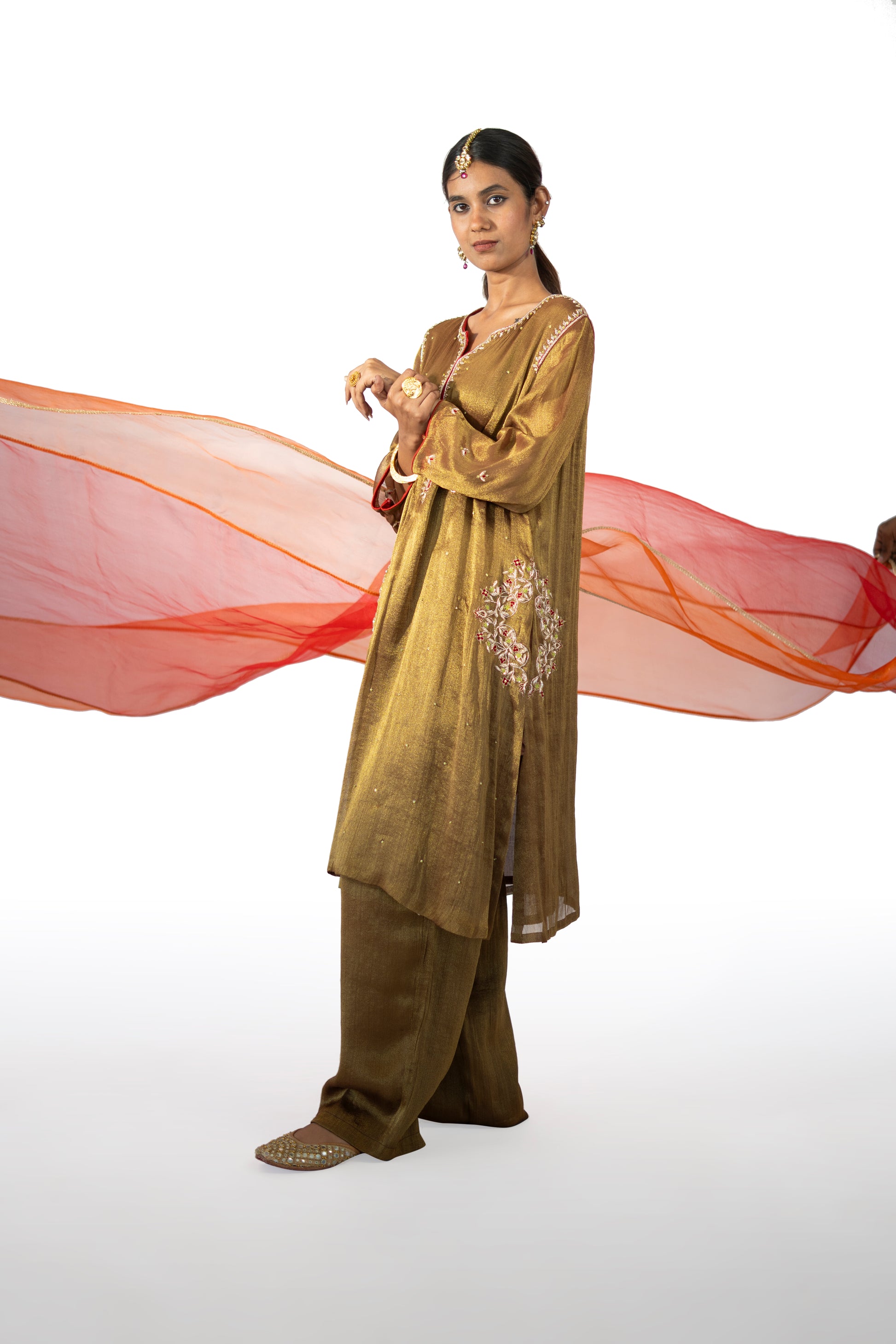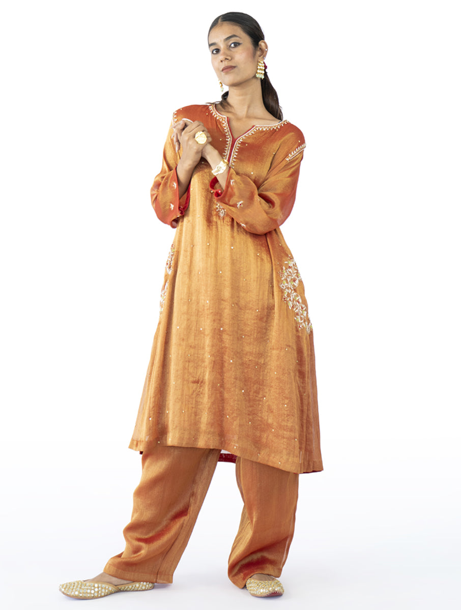 Experience timeless elegance with our red A-line Tissue kurta, intricately hand-embroidered with zardosi, tikki, and aari work. Crafted for both grace and functionality, the kurta features two side pockets and is fully lined to ensure comfort throughout the day. It is paired with matching fully lined palazzo pants, creating a refined and coordinated ensemble perfect for festive and formal occasions.